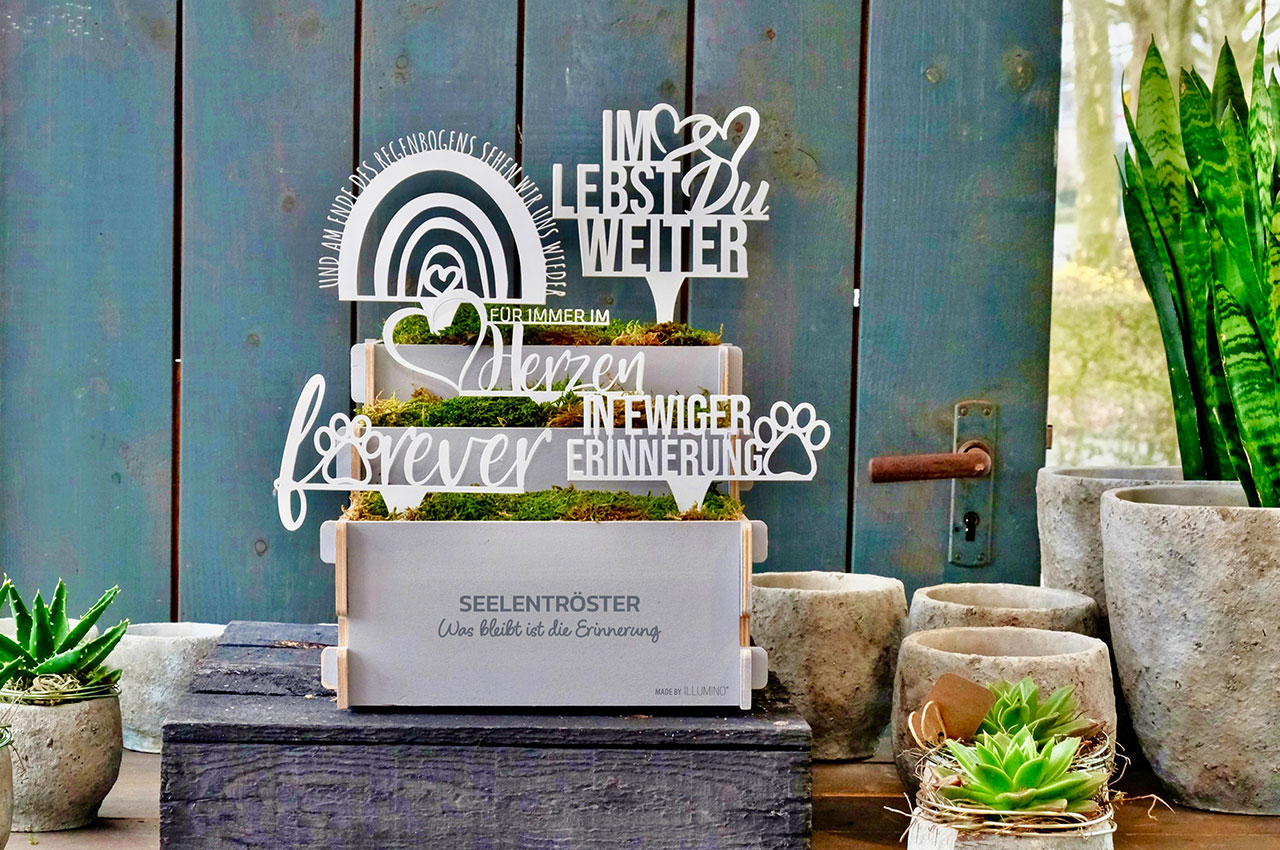 Der Grabstecker Seelentröster ist ein unvergessliches Symbol für die unendliche Liebe, die wir für unsere geliebten Verstorbenen hegen. Er erinnert uns an die unvergesslichen Zeiten, die wir mit ihnen teilen durften und daran, dass sie immer einen besonderen Platz in unseren Herzen haben werden.