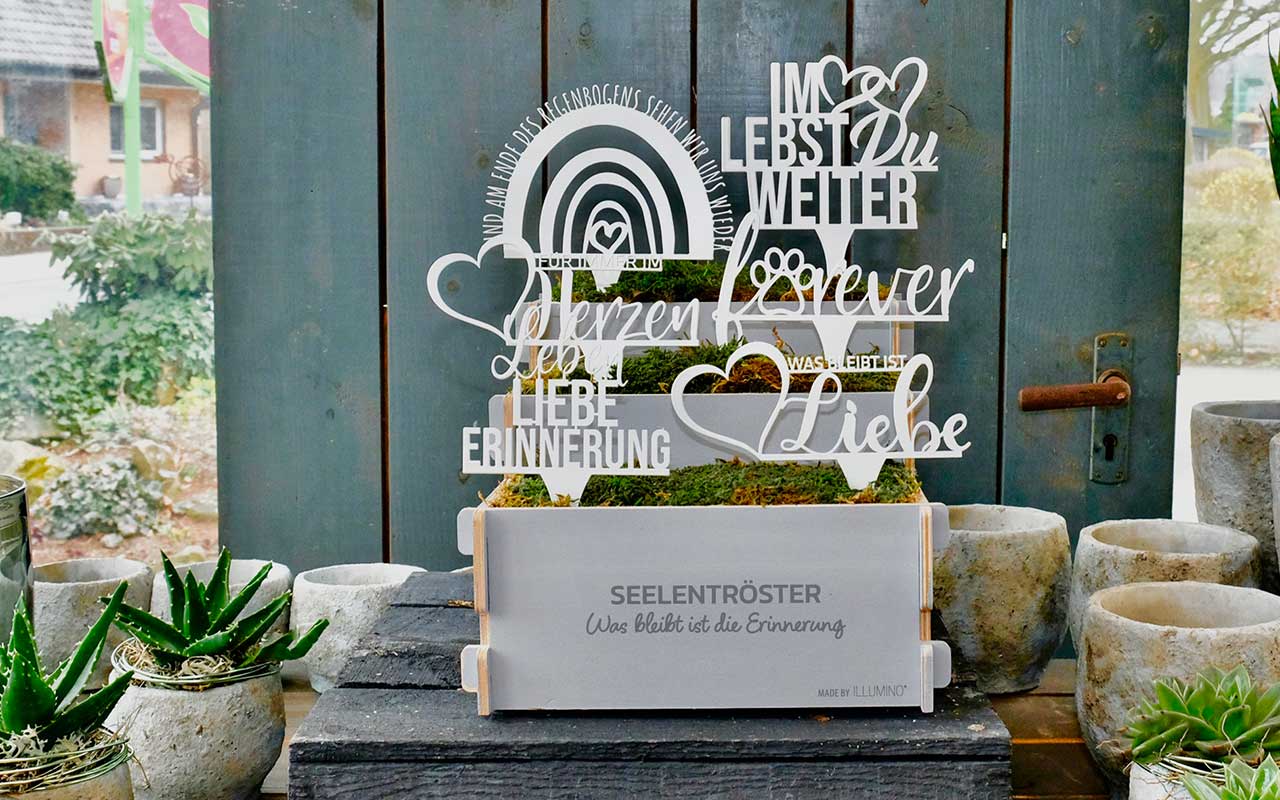 Der Grabstecker Seelentröster ist ein berührendes Symbol der unvergänglichen Liebe, die wir für unsere verstorbenen Liebsten empfinden. Er hält die Erinnerung an die gemeinsam verbrachten Zeiten wach und erinnert uns daran, dass die geliebten Menschen stets einen festen Platz in unseren Herzen behalten werden.